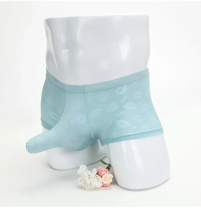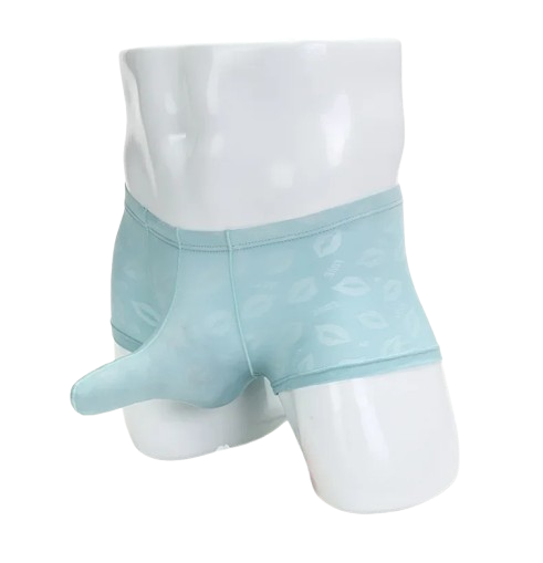 Męskie przezroczyste bokserki z przedłużonym przodem z wzorem w usta w kolorze błękitnym