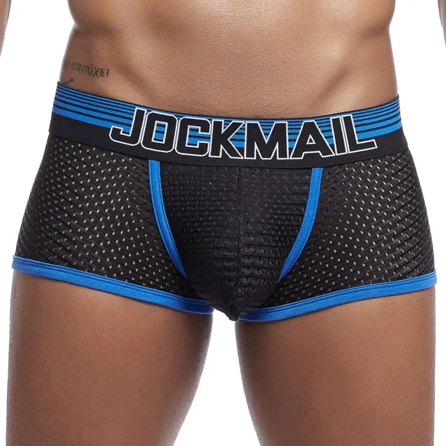 Męskie siateczkowe bokserki JOCKMAIL - czarne z niebieskimi wykończeniamiMęskie siateczkowe bokserki JOCKMAIL to doskonałe połączenie funkcjonalności i nowoczesnego designu. Wykonane z wysokiej jakości siateczkowego materiału w eleganckim czarnym kolorze z kontrastowymi niebieskimi wykończeniami i subtelnym wzorem teksturowym, zapewniają wyjątkową przewiewność i komfort noszenia przez cały dzień. Elegancki czarny kolor w połączeniu z żywymi niebieskimi akcentami, delikatną siateczkową teksturą oraz szeroka gumka z wyrazistym białym logotypem "JOCKMAIL" sprawiają, że te bokserki stanowią stylowy element męskiej garderoby. Wysokiej jakości siateczkowy materiał został zaprojektowany z myślą o maksymalnej wentylacji i swobodzie ruchu. Ergonomiczny krój idealnie dopasowuje się do sylwetki, zapewniając doskonały komfort i wsparcie.