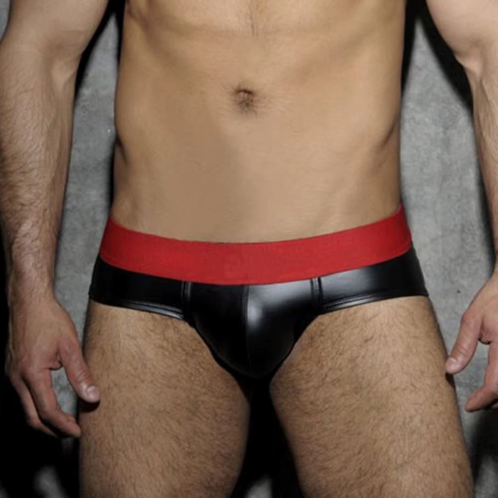 Męska bielizna - slipy z ekoskóry, które mają wyróżniającą się, elastyczną gumkę w pasie.