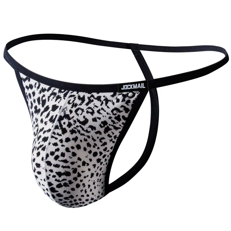Minimalistyczne męskie stringi. Skąpy krój, z naszywką logo JOCKMAIL, w panterkę.