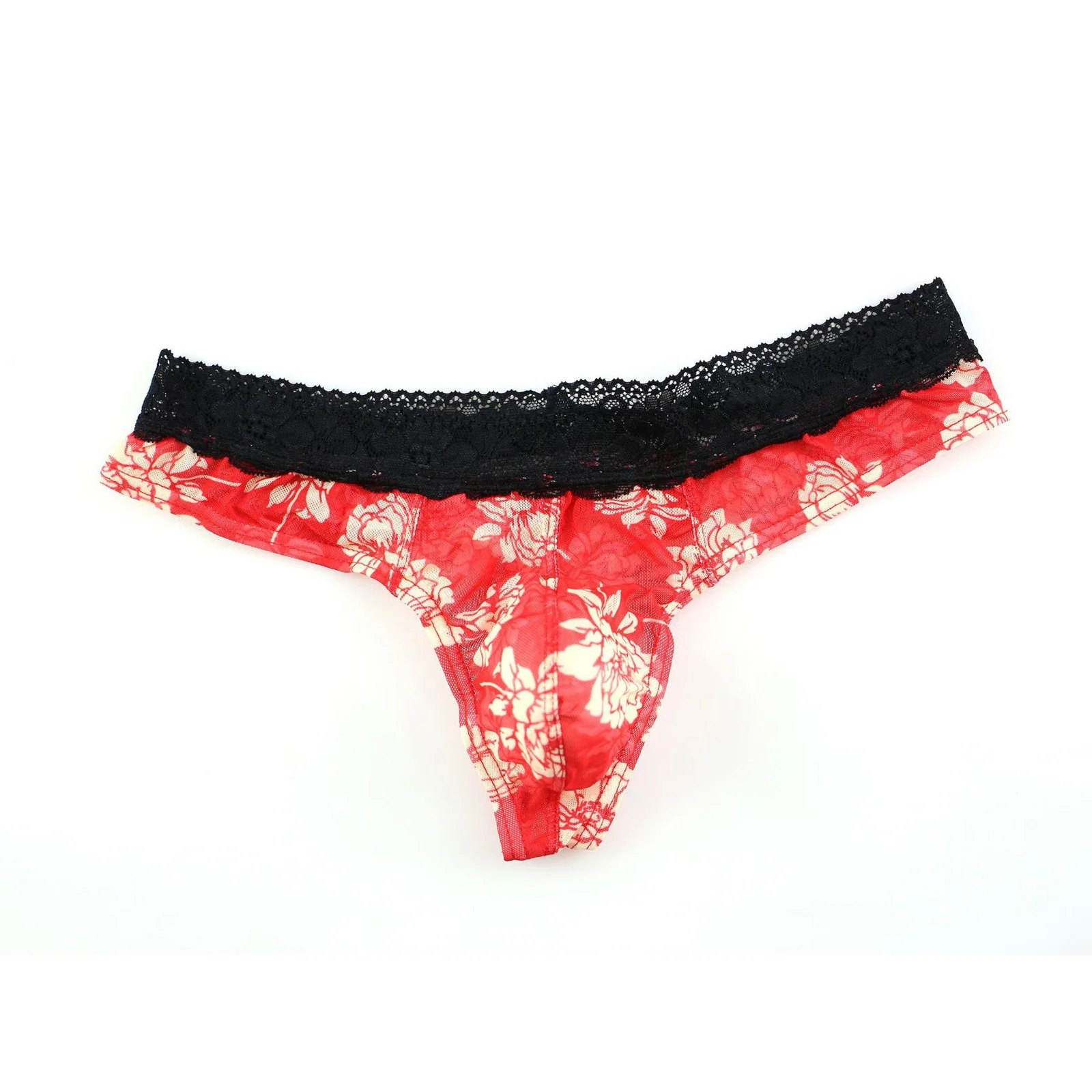 Męskie stringi, które są koronkowe. Prześwitujący materiał w kwiaty dodaje zmysłowości.