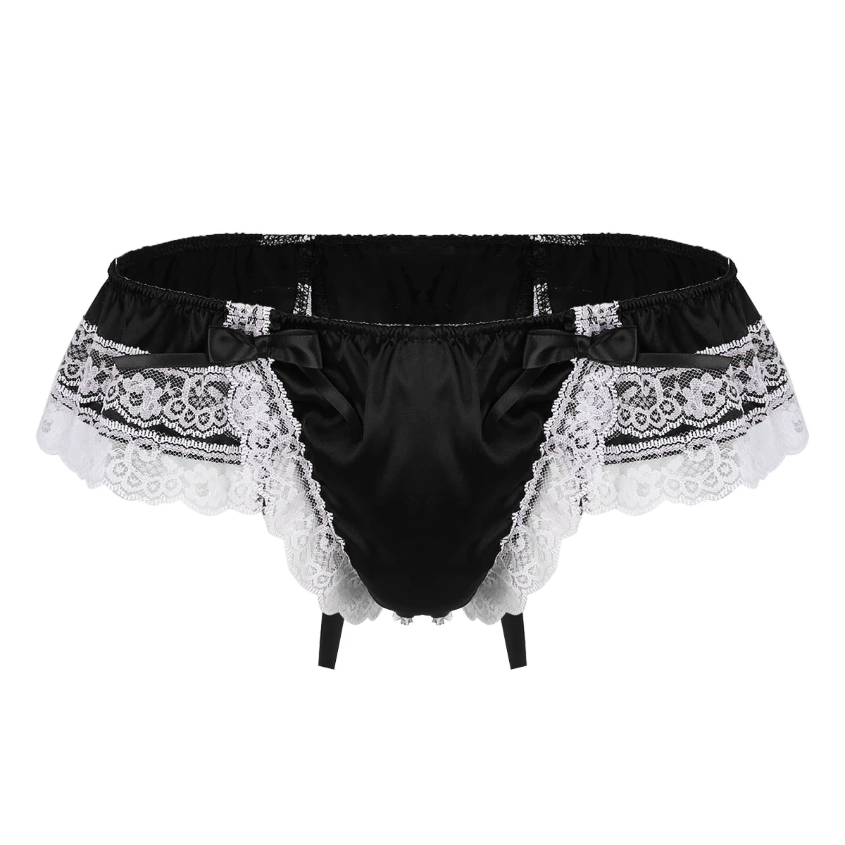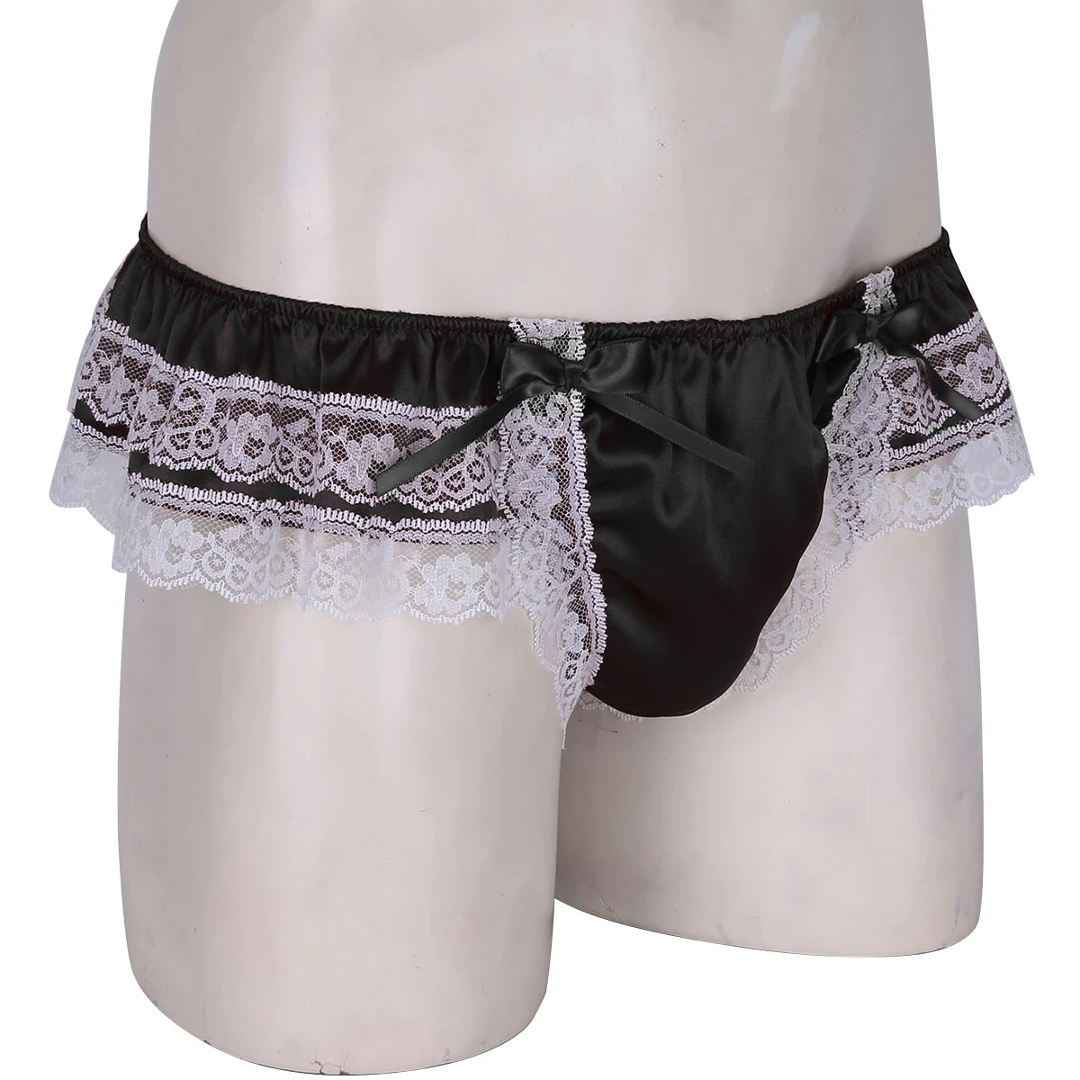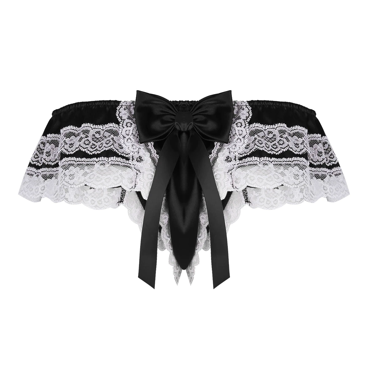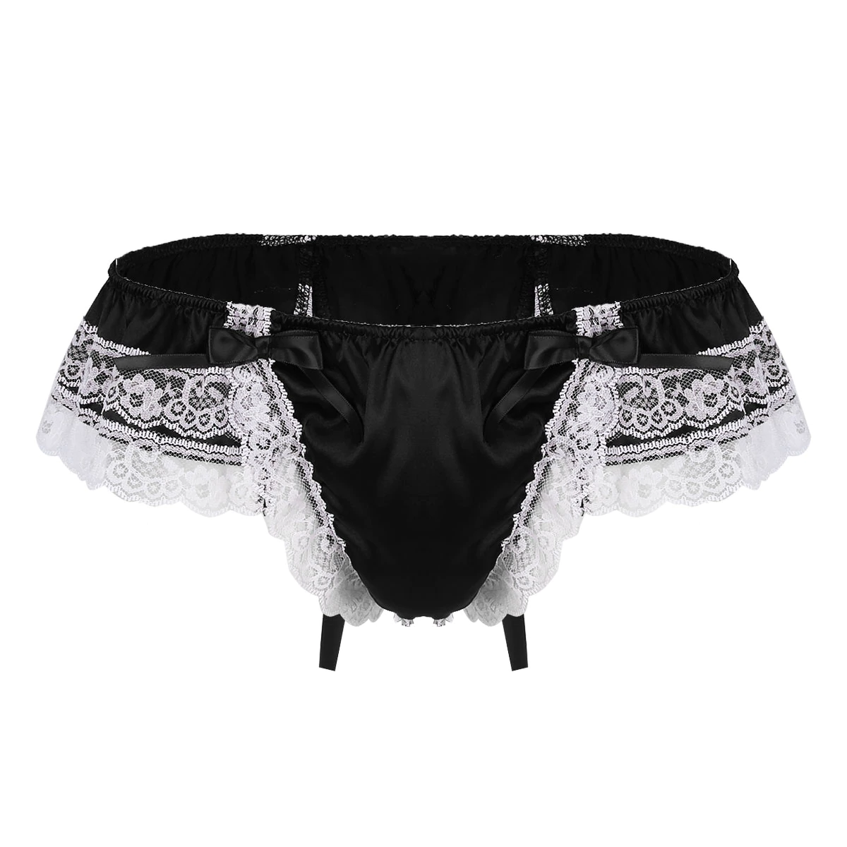 Męskie stringi, satynowe, z koronką i kokardką