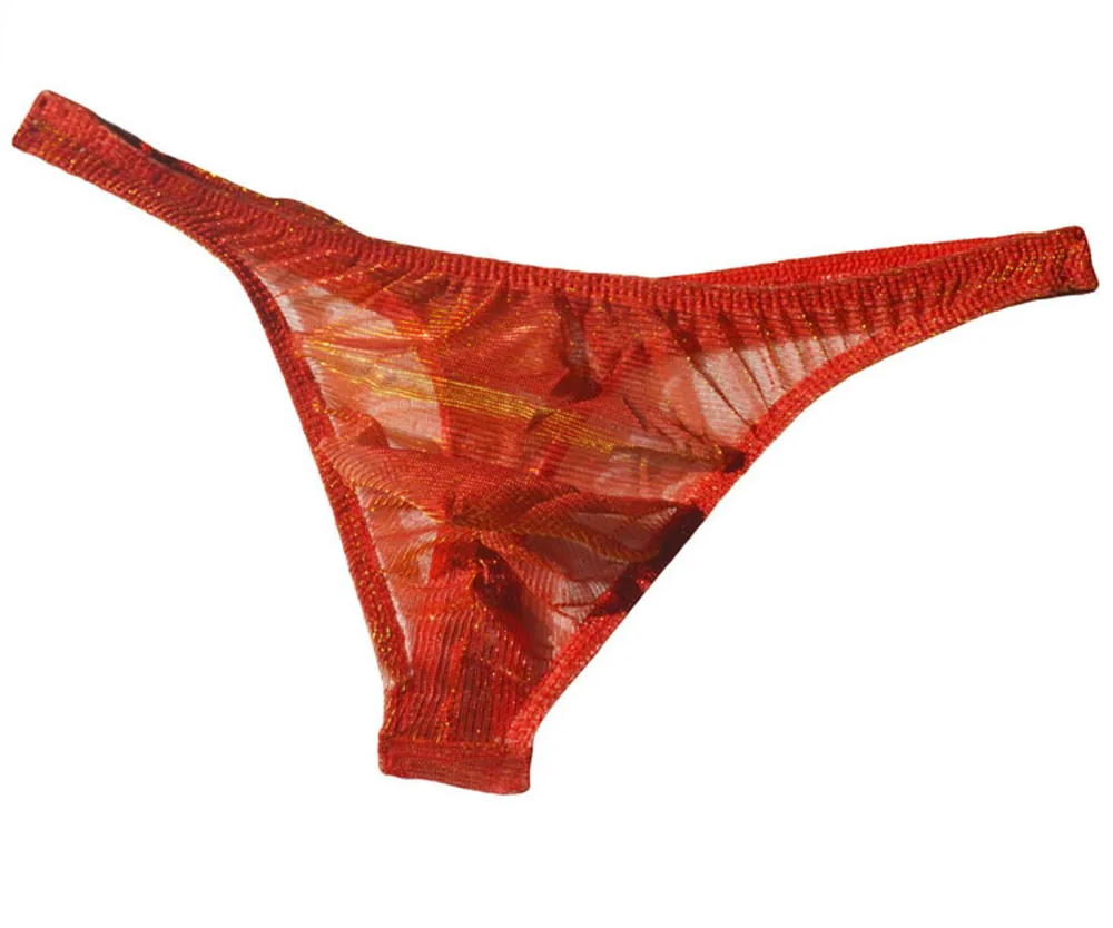 Męskie stringi przezroczyste – minimalistyczne, czerwono-złote z efektem zmiany koloru