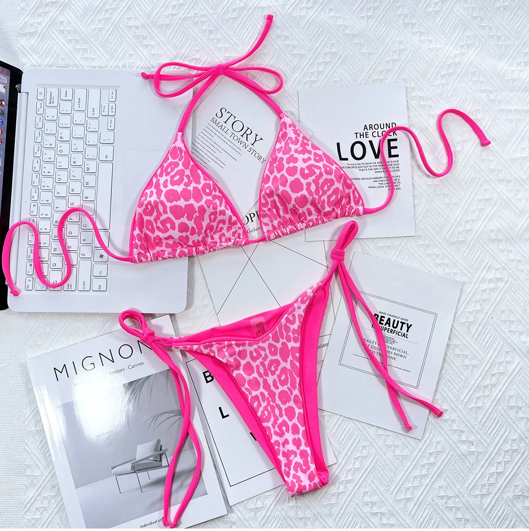 Neonowe bikini w panterkę, wiązany strój kąpielowy - różowy