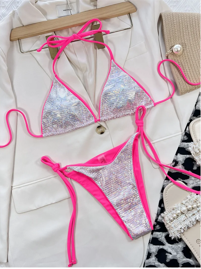 Neonowe srebrne bikini, wiązany strój kąpielowy - różowy sznurek