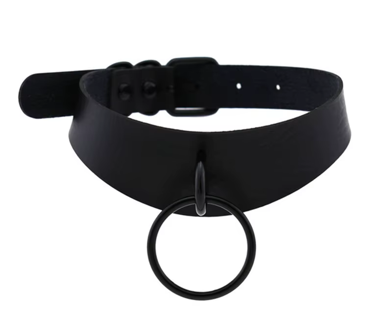 Obroża typu choker, z metalowym kółkiem, BDSMSkórzana obroża z ozdobnym metalowym kółkiem to propozycja idealna dla osób, które lubią odważne akcenty i chcą wyróżniać się unikalnym designem. Niezależnie od tego, czy nosisz ją jako modny gadżet – z pewnością przyciągnie uwagę i doda pewności siebie. Jest to akcesorium, które świetnie sprawdzi się zarówno jako uzupełnienie stylizacji na co dzień, ale też jako element do sesji zdjęciowej czy imprezy. Metalowe elementy są kompletnie czarne, przez co są trochę dyskretniejsze. Dlaczego warto kupić?