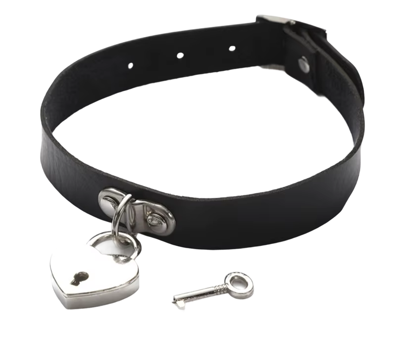 Wąska obroża z metalową kłódką w kształcie serca, i z kluczykiem. Ma regulowany pasek.