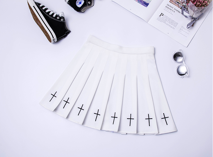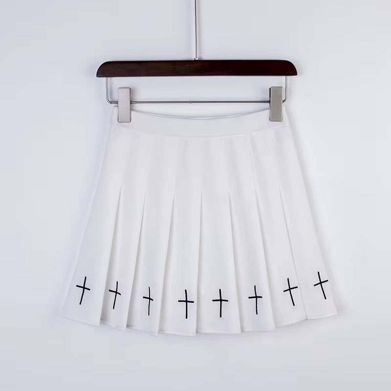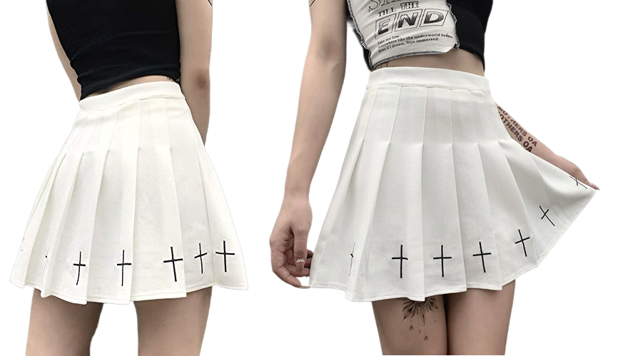 Plisowana spódniczka, wysoki stan, haft - białaSzukasz modnego i odważnego elementu do swojej garderoby? Nasza spódniczka goth z subtelnym haftem krzyży to doskonały wybór na każdą okazję. Idealna na koncerty, festiwale, czy spotkania z przyjaciółmi. Dzięki połączeniu klasycznego kroju z unikalnymi detalami, ta spódniczka zapewni Ci oryginalny wygląd, który przyciągnie uwagę. | ![]() |