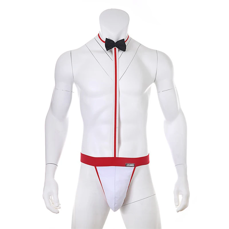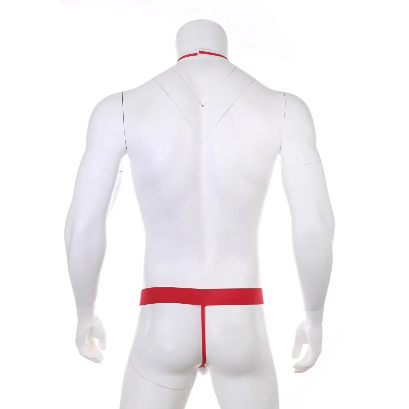 Strój kelnera z eleganckim kołnierzykiem i muchą to wyjątkowe połączenie stylu z oryginalnym designem. Wykonany z wysokiej jakości materiału z charakterystycznymi detalami, zapewnia komfort i niezwykły wygląd. Czerwony kolor z białymi akcentami sprawia, że ten strój wyróżnia się eleganckim charakterem. Ten stylowy zestaw składa się z kołnierzyka z muchą oraz dopasowanych stringów, tworząc spójną kompozycję. Materiał o gładkiej fakturze jest przyjemny w dotyku i zapewnia wygodę noszenia.