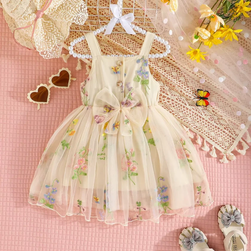 Delikatna, tiulowa sukienka dla dziewczynki. Mocno wiosenny haft w postaci kwiatów.