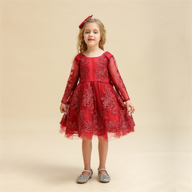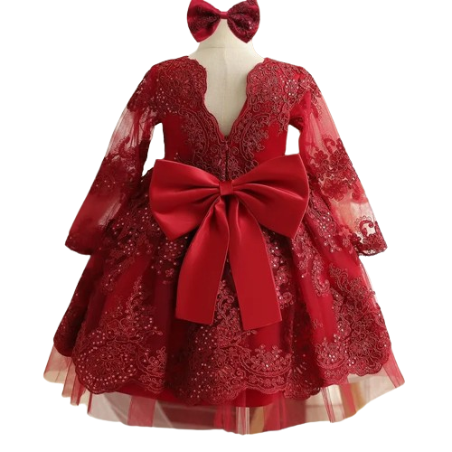 Sukienka cekinowa dla dziewczynki w głębokim czerwonym kolorze – idealne połączenie elegancji i baśniowego uroku. Ozdobiona błyszczącymi cekinami i koronkowymi aplikacjami, piętrową spódnicą z tiułu i dużą satynową kokardką na przedzie oraz z tyłu. W zestawie pasująca kokardka do włosów. Perfekcyjna sukienka dla każdej małej księżniczki na specjalne okazje!