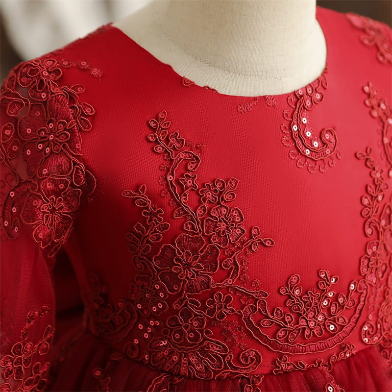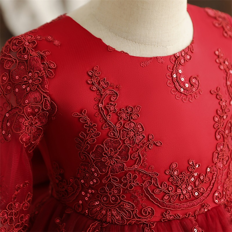 Wyjątkowa sukienka w pięknym czerwonym kolorze, która zachwyci każdego swoim eleganckim designem. Górna część sukienki ozdobiona jest delikatnymi haftami koronkowymi z błyszczącymi cekinami, z długimi transparentnymi rękawami z koronki dodającymi dziewczęcego uroku. Piętrowa spódnica z tiulu z koronkowymi aplikacjami i cekinami tworzy bajkowy efekt, który pięknie się rozwija podczas ruchu. Duża satynowa kokarda z tyłu sukienki stanowi główny punkt kreacji, podkreślając sylwetkę i dodając elegancji. W zestawie znajduje się pasująca kokardka do włosów w tym samym kolorze. . |