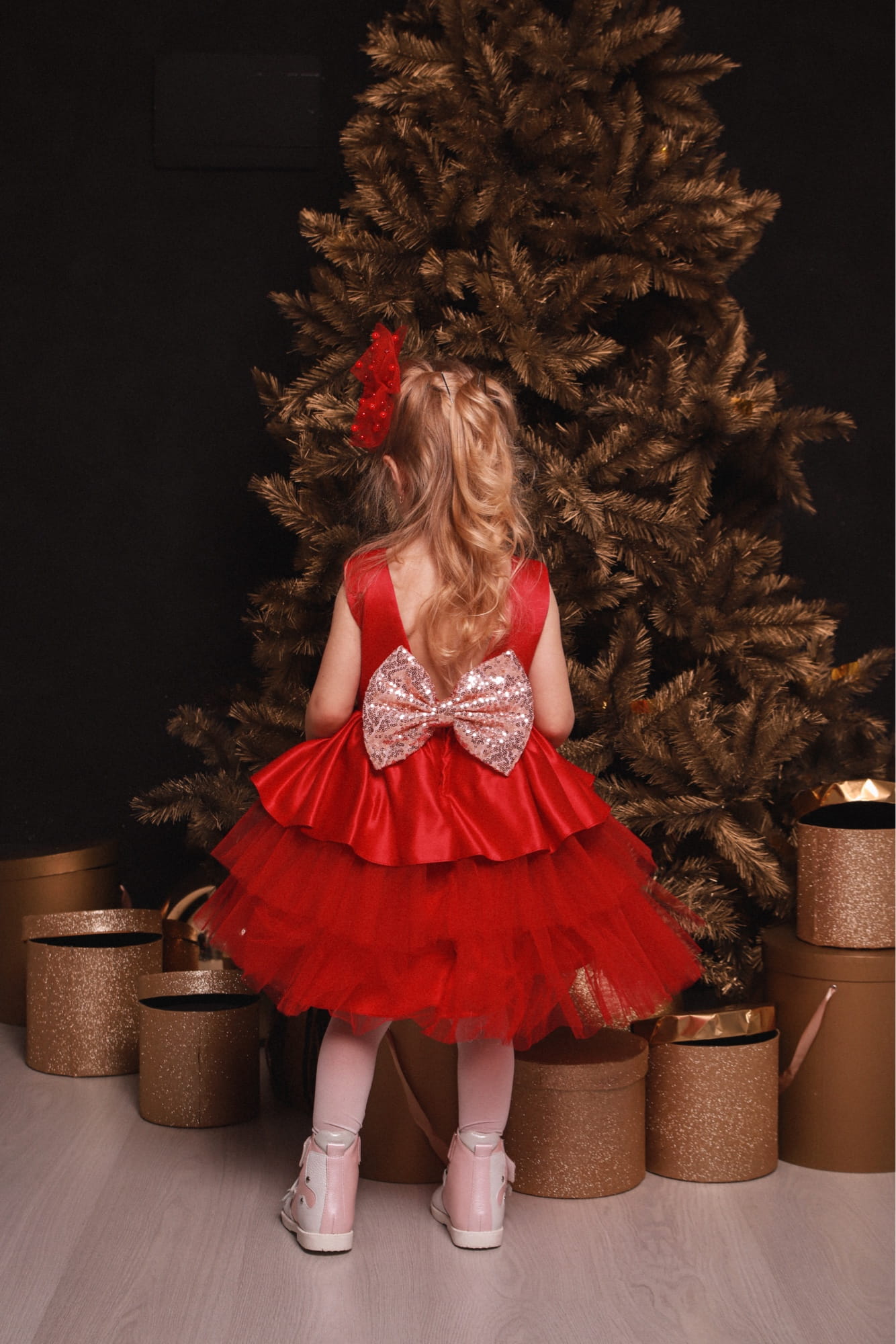 Sukienka dla dziewczynki z cekinowymi kokardami w czerwonym kolorze – idealne połączenie elegancji i baśniowego uroku. Ozdobiona dwiema spektakularnymi cekinowymi kokardami w złotym kolorze, z satynową górą bez rękawów i wielowarstwową spódnicą z tiulu. Perfekcyjna sukienka dla każdej małej księżniczki!