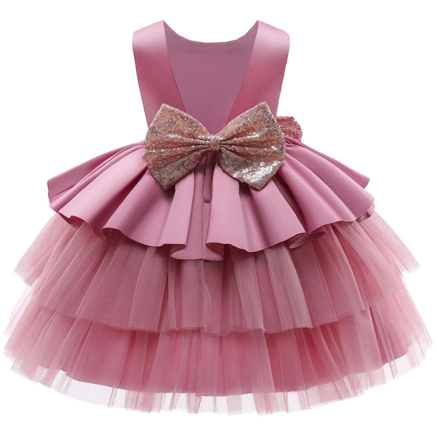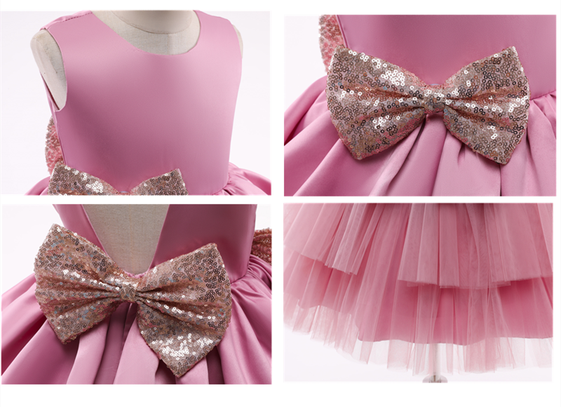 Sukienka dla dziewczynki z cekinowymi kokardami w różowym kolorze – idealne połączenie elegancji i baśniowego uroku. Ozdobiona dwiema spektakularnymi cekinowymi kokardami w złotym kolorze, z satynową górą bez rękawów i wielowarstwową spódnicą z tiulu. Perfekcyjna sukienka dla każdej małej księżniczki!
