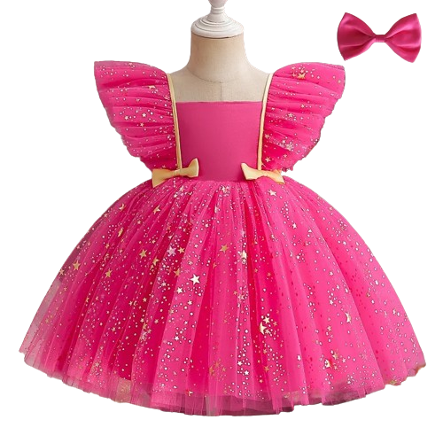 Wyjątkowa sukienka ze złotymi gwiazdkami i tiulowymi skrzydełkami na ramionach. Tiulowa spódnica z migoczącymi gwiazdkami i kokardka do włosów w zestawie. Idealna kreacja dla małej księżniczki na każdą uroczystą okazję.