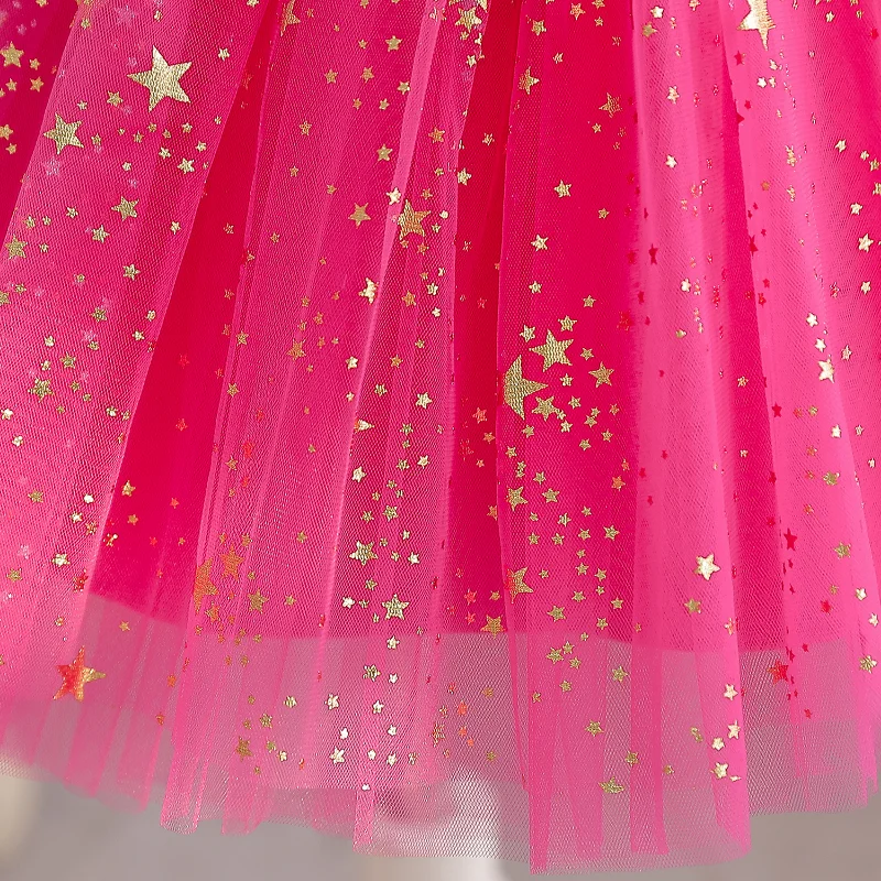 Wyjątkowa sukienka w eleganckim różowym kolorze z przepięknymi złotymi gwiazdkami. Górna część wykonana z różowej tkaniny z prostokątnym dekoltem i spektakularnymi tiulowymi skrzydełkami na ramionach ozdobionymi błyszczącymi złotymi gwiazdkami. Charakterystyczną cechą są żółte ramiączka z kokardkami, które pięknie kontrastują z różową podstawą. Spódnica w różowym odcieniu wykonana z delikatnego tiulu pokrytego migoczącymi złotymi gwiazdkami nadaje strojowi wyjątkowy, bajkowy charakter. |
