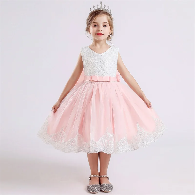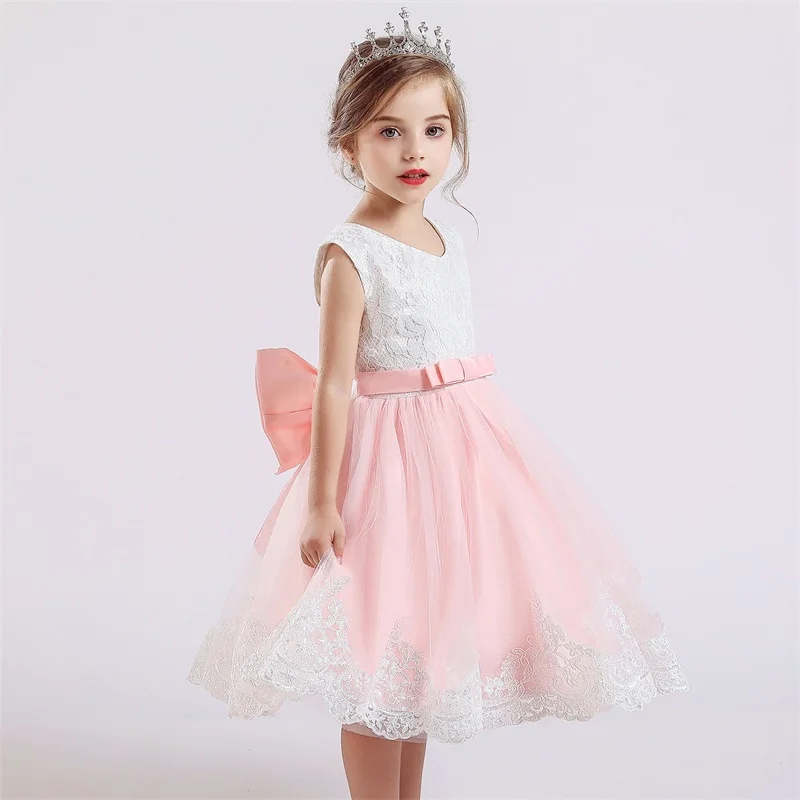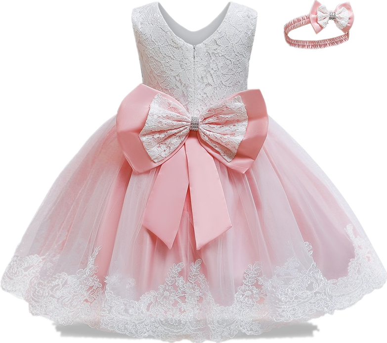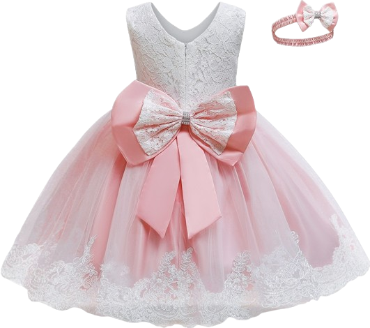 Sukienka dla dziewczynki z koronkową kokardą w biało-różowym kolorze – idealne połączenie elegancji i baśniowego uroku. Ozdobiona spektakularną koronkową kokardą, z górą z koronki i wielowarstwową spódnicą z koronkowymi aplikacjami. W zestawie opaska na główkę z kokardką. Perfekcyjna sukienka dla każdej małej księżniczki!