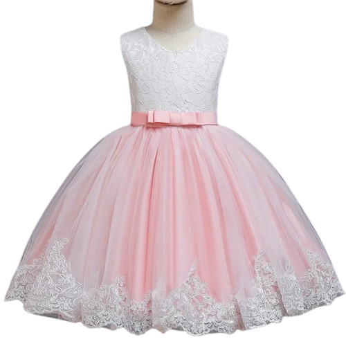 Przepiękna sukienka w eleganckim biało-różowym kolorze z dopasowaną opaską na główkę. Górna część wykonana z białej koronki z eleganckim dekoltem w kształcie serca bez rękawów. Główną ozdobą jest spektakularna koronkowa kokarda w biało-różowym kolorze na talii - delikatny wzór koronki pięknie komponuje się z całością. Spódnica w różowym odcieniu ozdobiona białymi koronkowymi aplikacjami nadaje stroju wyjątkowego, bajkowego charakteru. |