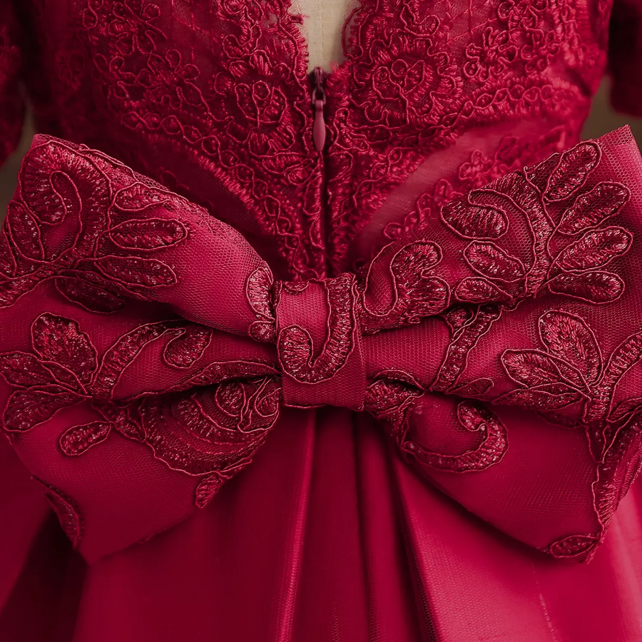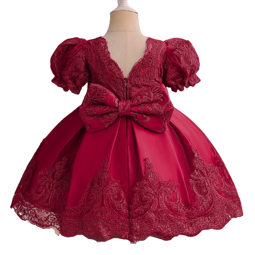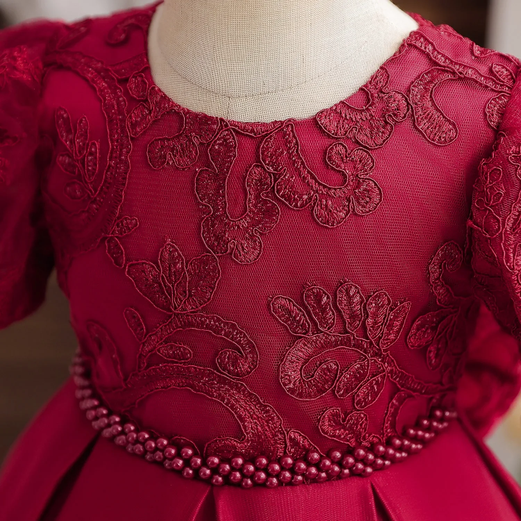 Sukienka dla dziewczynki z koronkowymi haftami w czerwonym kolorze – idealne połączenie elegancji i baśniowego uroku. Ozdobiona bogatymi haftami w kwiatowe wzory, z bufiastymi rękawkami z koronki i spektakularną kokardą w pasie. Satynowa spódnica z koronkowymi aplikacjami. Perfekcyjna sukienka dla każdej małej księżniczki!