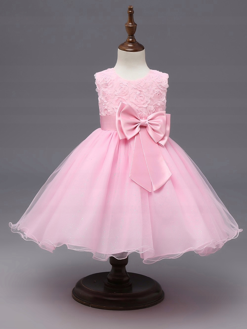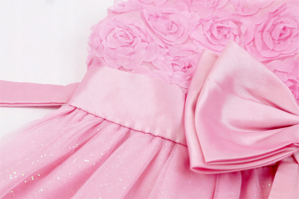 Wyjątkowa sukienka z różyczkami na gorsecie i tiulową spódnicą z brokatem. Duża satynowa kokarda w pasie dodaje elegancji. Idealna kreacja dla małej księżniczki na każdą okazję.