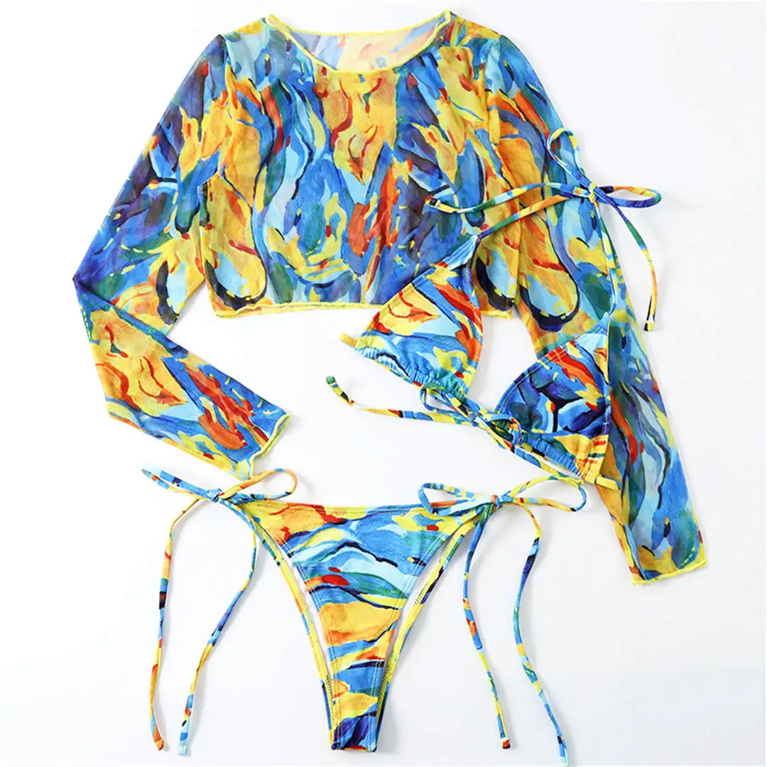Kolorowe bikini to efektowny trzyczęściowy zestaw, który łączy intensywną niebieską kolorystykę z dynamicznymi, artystycznymi wzorami. Odcienie błękitu, żółtego, pomarańczowego i fioletu tworzą harmonijny, energetyczny wygląd inspirowany abstrakcyjną sztuką współczesną. Wiązane detale w komplecie z stylową narzutką z długim rękawem tworzą kobiecy, nowoczesny look idealny na wakacyjne wypady. | ![]() |